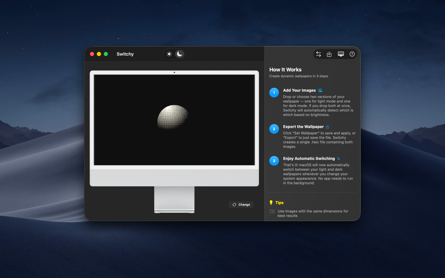 Switchy Wallpaper is a native macOS app for creating dynamic wallpapers. Turn your photos into time-shifting wallpapers that change throughout the day.